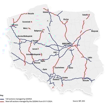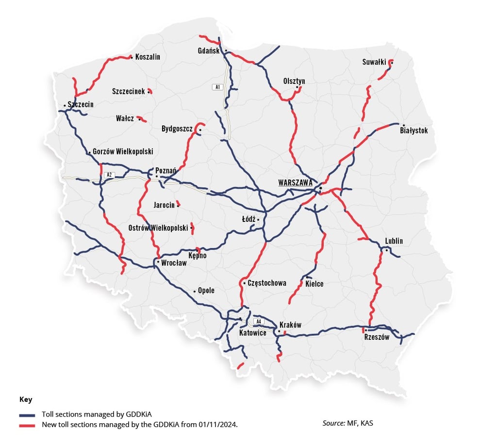Nuo lapkričio 1 d. Lenkijoje bus išplėstas mokamų kelių ruožų tinklas. Vairuotojai apie naujus mokamus kelių ruožus sužinos iš kelio ženklų, pastatytų išilgai išplėsto mokamų kelių tinklo. Ypač į naujus kelio ženklus turėtų atkreipti dėmesį vietinės reikšmės kelių (pvz., esančių netoli Szczecinek, Wałcz, Jarocin, Ostrów Wielkopolski ar Kępno), kuriais iki šiol važiavo nemokamai, naudotojai.